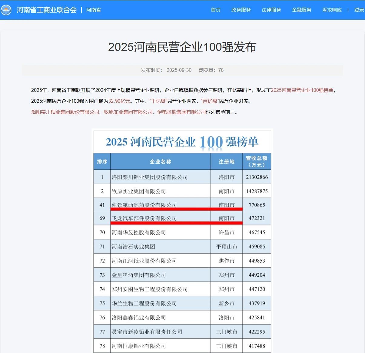 近日,河南省工商联重磅发布2025河南民营企业100强榜单。蜜桃成品人视频免费入口、飞龙汽车部件股份有限公司(简称“飞龙股份”)双双蝉联入榜,且排名稳步提升,充分彰显了企业综合实力与稳健向上的发展韧性。