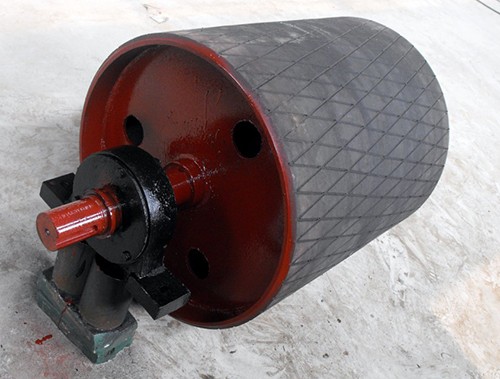 传动滚筒是输送机传递动力的部件。其驱动带式输送机的方式有单滚筒、双滚筒及多滚筒之分。单滚筒多用于功率不太大的输送机上,如煤矿地面运输及选煤厂等处。井下带式输送机一般均采用双滚筒,以使输送机结构紧凑。传动滚筒表面有裸露光钢面,人字形和菱形花纹橡胶覆面。小功率、小带宽及环境干燥时可采用裸露光钢面。人字形花纹胶面摩擦系数大,防滑性和排水性好,但有方向性。菱形胶面用于双向运行的输送机。